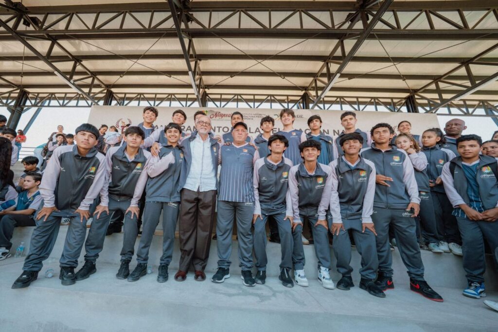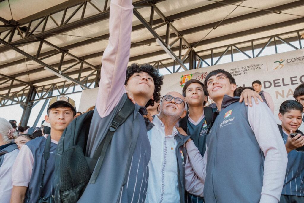 Acompañado por su esposa, doctora Beatriz Estrada Martínez, presidenta del Sistema DIF Nayarit, destacó el apoyo integral del gobierno en transporte, alimentación, uniformes y hospedaje para los atletas.