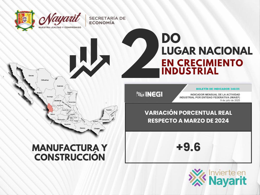 De acuerdo con el Indicador Mensual de la Actividad Industrial por Entidad Federativa (IMAIEF) del INEGI Informa, Nayarit ocupa el 2do. lugar a nivel nacional en crecimiento de la actividad industrial, durante marzo de 2025, consolidándose como uno de los estados con mayor dinamismo.