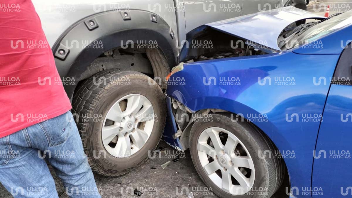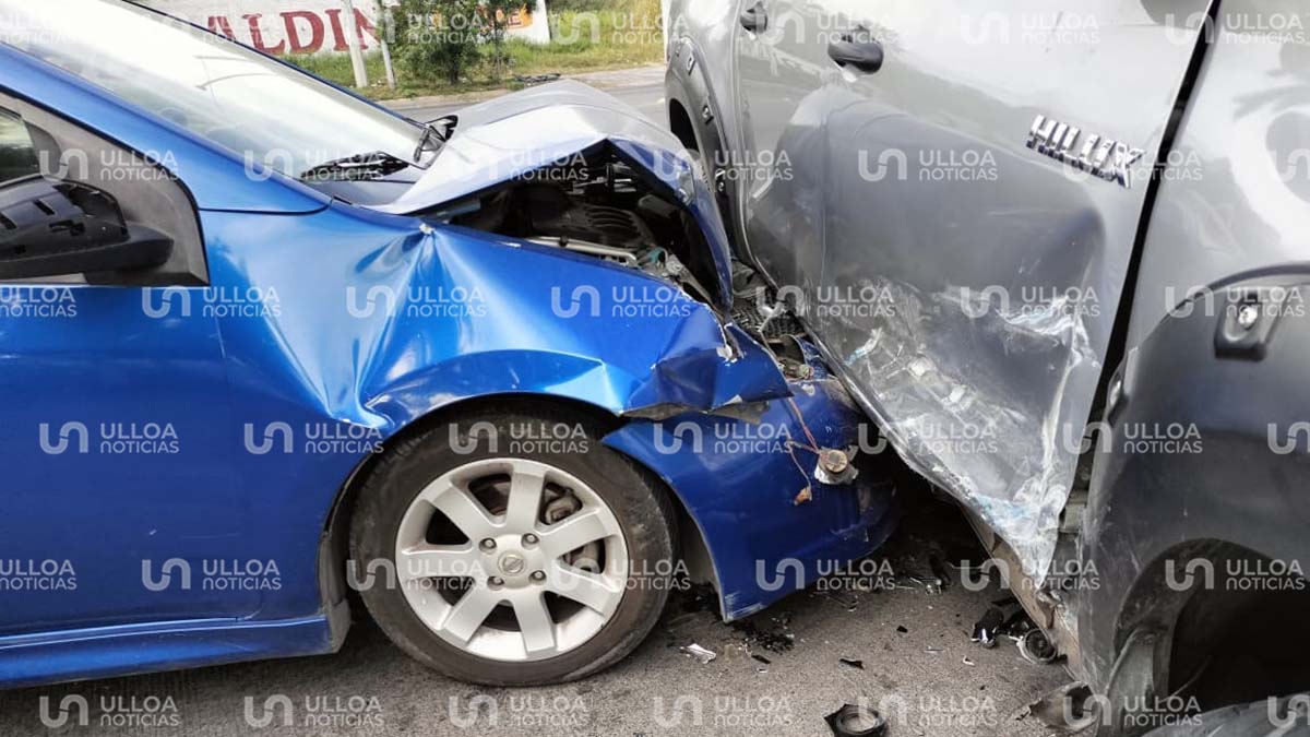Tras la colisión, el vehículo Sentra sufrió daños severos en su parte frontal y en la zona del motor, quedando parcialmente incrustado debajo de la camioneta, justo a la altura de la puerta lateral derecha.