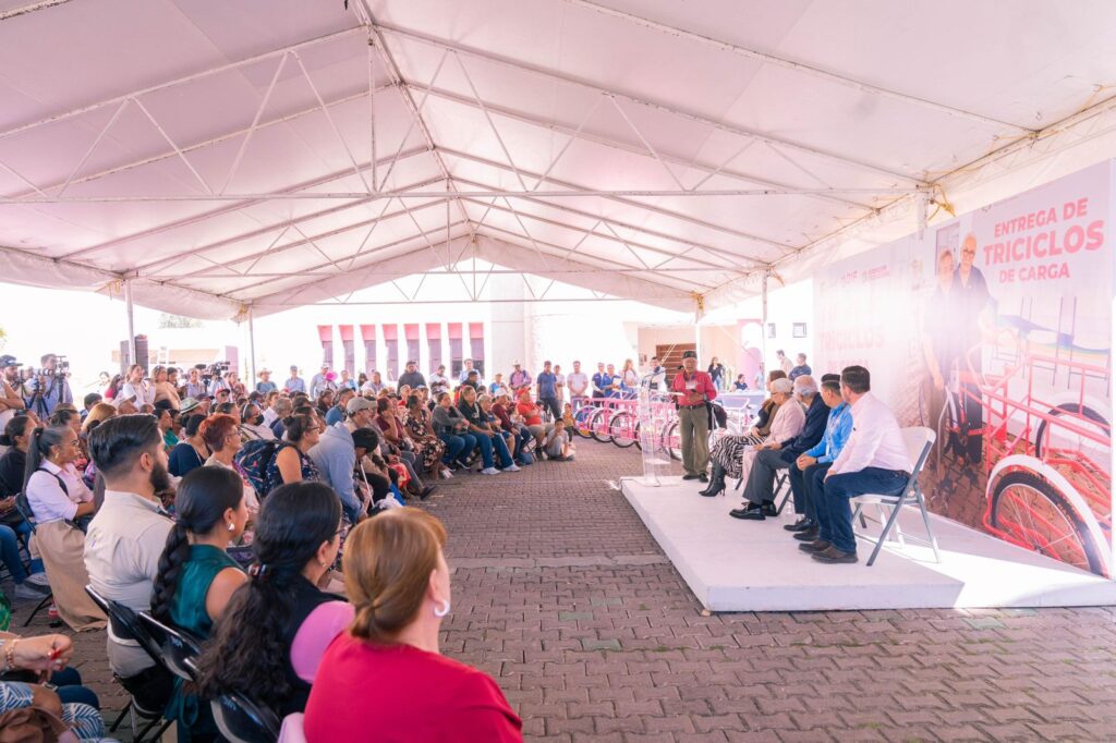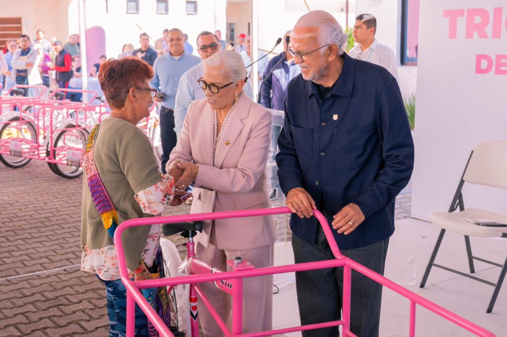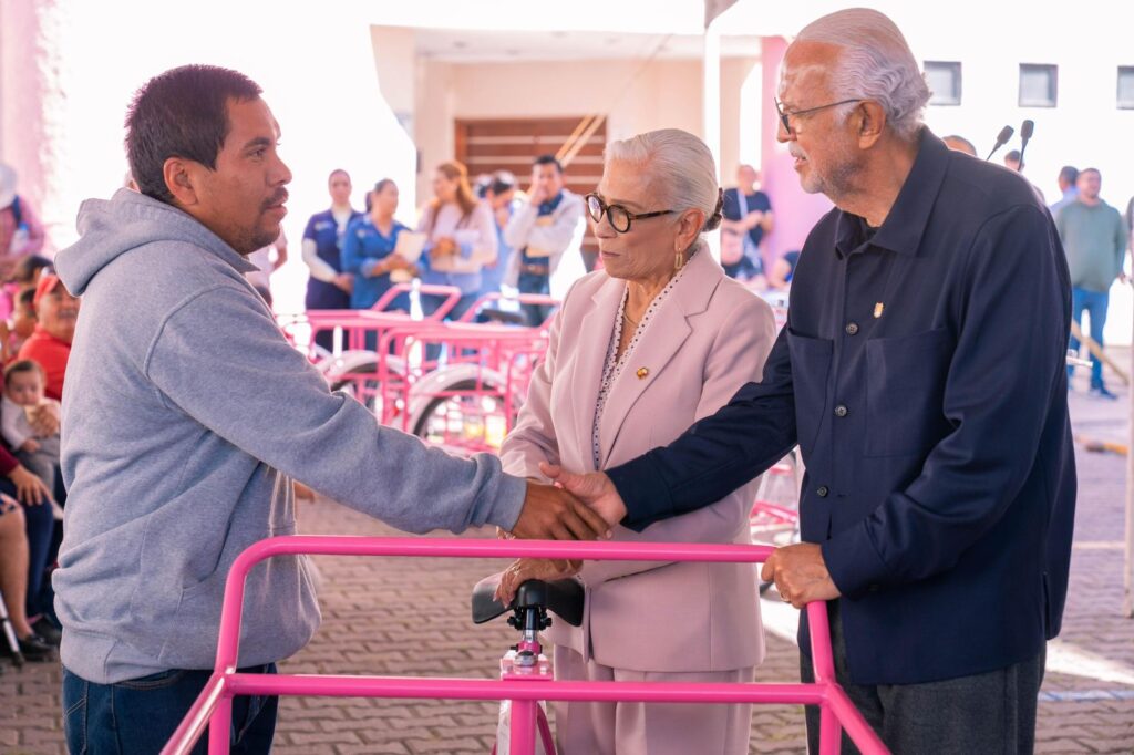 La presidenta del Sistema DIF Nayarit, doctora Beatriz Estrada Martínez, y su esposo, el gobernador del estado, Miguel Ángel Navarro Quintero, realizaron la entrega de triciclos de carga a 130 familias de 18 municipios de la entidad, una acción que fortalece el autoempleo y respalda el esfuerzo diario de quienes buscan generar ingresos propios y mejorar su calidad de vida.